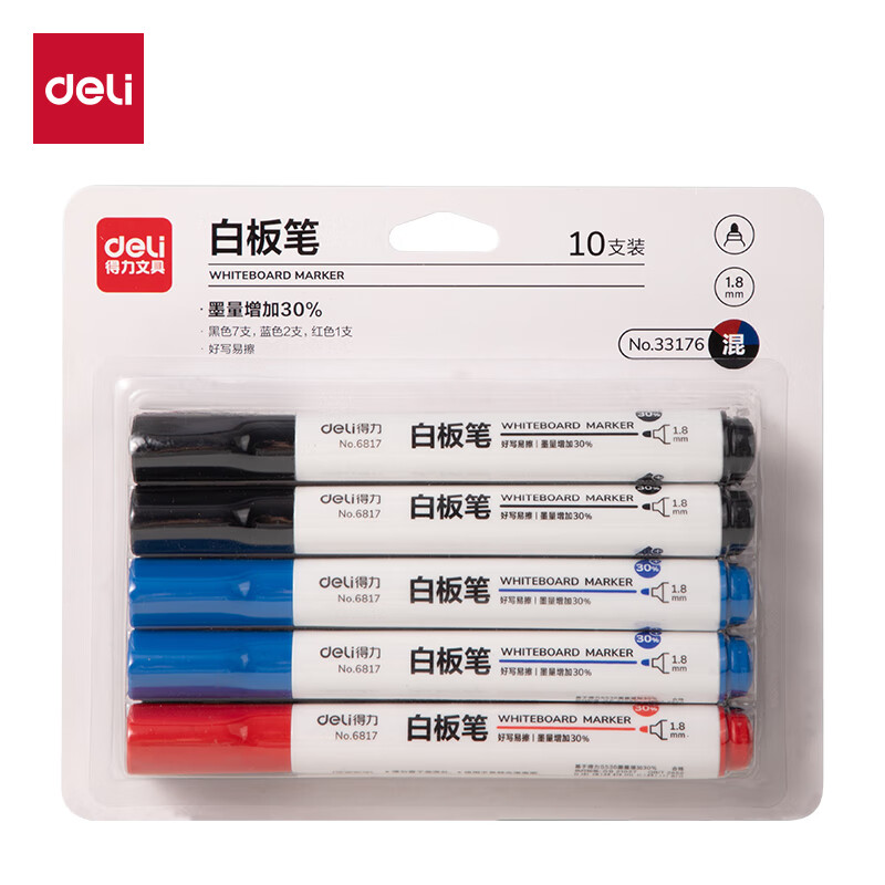 得力(deli) 白板笔套装 可擦易擦书写顺滑 办公文具会议教学 7黑2蓝1红混色 10支/盒 33176